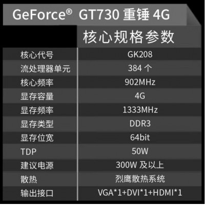 铭瑄MS-GT730重锤4G / DDR3 / 64bit 电脑显卡 入门独显